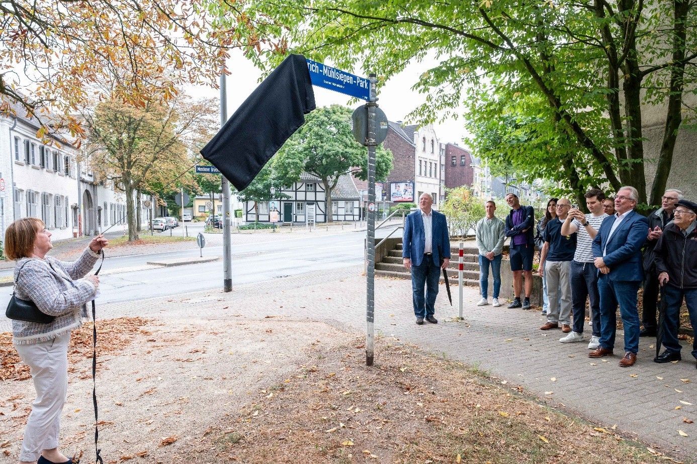 Nach diesen Worten enthüllt sie das Straßenschild und übergibt damit gewissermaßen den Heinrich-Mühlsiepen-Park der Öffentlichkeit.